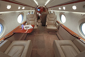 The cabin volume for the Gulfstream GV is 1,669 cubic feet. Typical configuration features 13 passenger and 2 crew seats.
